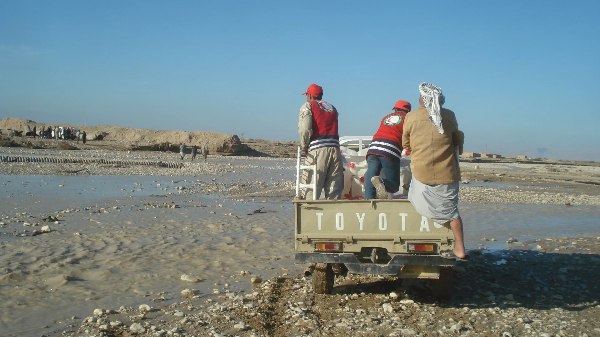 في أرض موحلة غمرتها مياه السيول على بعد كيلو مترات قليلة من الحدود العراقية – الإيرانية يحمل ثلاثة متوعين من الهلال الأحمر العراقي مساعدات إنسانية على أكتافهم ويشقون طريقهم نحو منازل متناثرة ضمن قرية نائية تابعة لناحية قزانية (124 كم) شرق بعقوبة.