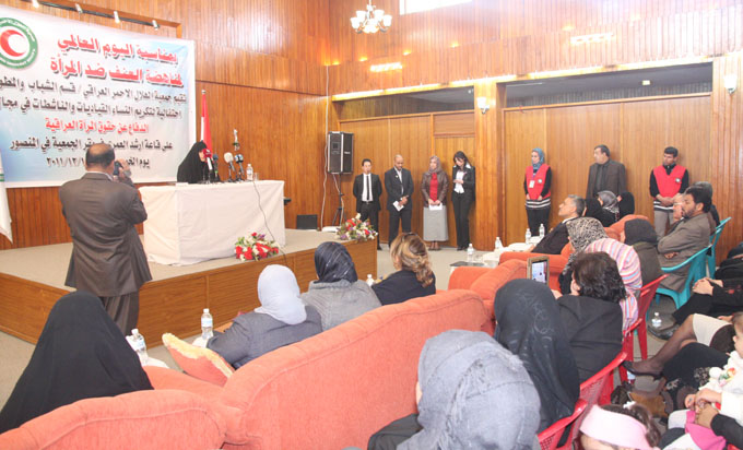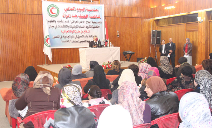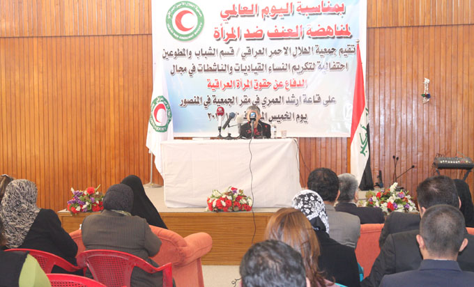 نائب رئيس الهلال الاحمر الدكتور رعد التميمي قال” كلنا امل ان يكون هذا الاحتفال دافعا لزيادة اهتمام مجتمعنا افراد وجماعات بالتصدي لظاهرة العنف ضد المرأة وزيادة الوعي لدى الافراد والاسر ومؤسسات الدولة للعمل جميعا للوقوف ضد جميع الممارسات غير الانسانية التي تمارس ضد المرأة سواء ان كانت على شكل عنف جسدي او معنوي او مادي مضيفا ان الهلال الاحمر العراقي يولي اهتماما بالغا للمرأة من خلال مساعدة كافة الشرائح النسوية في المجتمع العراقي من خلال تقديم اعانات مالية واقامة دورات تأهيلية لمحاولة زج المرأة في كافة النشاطات الانسانية التي تقوم بها الجمعية.