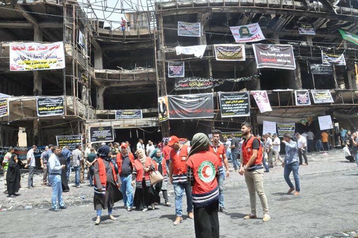 قامت فرق الهلال الاحمر العراقي بزيارة عدد من المستشفيات في بغداد للاطلاع على اوضاع الجرحى والمصابين جراء تفجرات الكرادة لتقديم الدعم النفسي لهم وتلبية احتياجاتهم. حيث قامت فرق الهلال بزيارة قسم الحروق في مدينة الطب ومستشفى الشهيد غازي الحريري ومستشفى الكندي للاطلاع على اوضاع الجرحى والمصابين الراقدين في تلك المستشفيات لتقديم يد العون لهم والرفع من حالتهم المعنوية